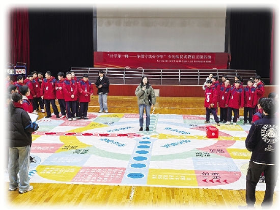 “要是遇到校园霸凌,我们该怎么寻求帮助呀?”“和我们未成年人有关的法律都有哪些呢?”活动现场,学生们除了通过投掷骰子力争最先到达终点外,还要一路“过关斩将”接受答题挑战。当他们走到棋盘上的答题格时,跟组的工作人员便会适时抛出一个个与法律相关的问题。大家积极开动脑筋,踊跃举手回答。答对的学生脸上洋溢着自豪的笑容,脚步轻快地向前迈进;答错的学生也不气馁,自觉地按照规则深蹲3个,然后继续勇敢地前进。在这轻松愉快又充满挑战的氛围中,学生们不知不觉地学习到了丰富的法律知识。