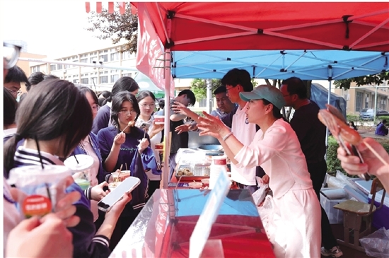 操场上,融合了“五四精神”元素的标语、环保手工艺品、学科主题体验区等特色摊位,引得师生们纷纷驻足;部分班级还推出了套圈、射击等游戏,吸引了一大批跃跃欲试的学生。
