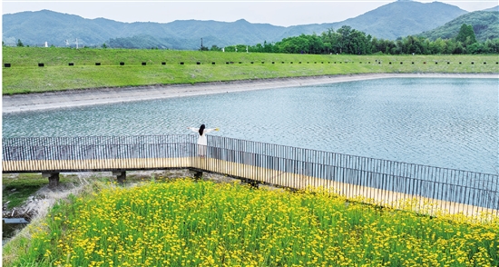 初夏至,上浦镇凤凰山考古遗址公园内的凤翎湖畔,大片金鸡菊竞相绽放,花色明艳如阳光。