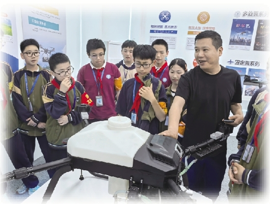 在沉浸式体验学习中,学生们充满好奇和憧憬,他们在企业展厅仔细观察着各类无人机,并时不时向工作人员询问。公司沈助告诉学生们,“一架工业无人机,它的诞生需经历200余项测试,是研发团队数千小时劳动的结晶。从精密零部件加工到整机调试,每一道工序都凝聚着科技劳动者的汗水与创新。”学生们听后感慨道:“原来科技劳动既是脑力活,也是体力活,更需要匠心精神!”