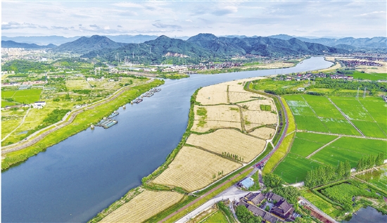 近日,曹娥江两岸天朗气清,能见度极高。金黄的麦田和碧绿的粮田沿江铺展,与蔚蓝的江水相映成趣,尽显自然之美与田园生机。