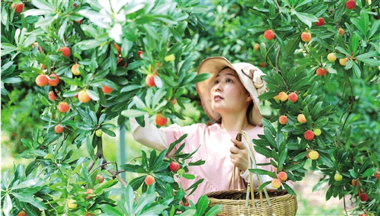 5月27日,驿亭镇大棚杨梅已进入成熟期,翠绿枝头缀满红润果实,深红种与水晶种杨梅成为主角。作为“二都杨梅”核心产区,驿亭镇通过数字大棚技术与露天杨梅实现错峰上市。目前,当地杨梅种植面积3万亩,占全区80%以上。 记者 魏新宇 摄