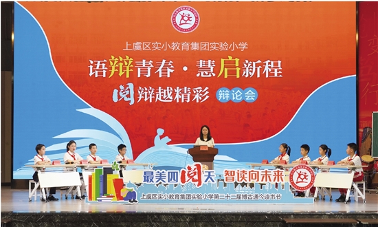 日前,实小集团实验小学开展第22届博古通今读书节。二年级学生举行“‘阅’讲越动听”讲故事比赛,“故事大王”们用有趣多样的方式对多彩故事进行演绎;五年级学生开展“‘阅’辩越精彩”辩论赛,辩手们旁征博引,将论点娓娓道来,构建起逻辑严密的论证体系;六年级“讲书人”们将自己的阅读感悟与智慧,化作一幅幅精美的展板、一份份饱含深情的文稿,向大家推荐自己心仪的好书。