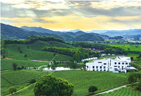 8月6日,章镇茶山脚下,咖啡小屋半掩于翠绿茶园,秋千轻晃于碧波小湖。落日熔金时,竹廊木椅落满霞光,游客执杯远眺层叠茶山,湖面倒映鎏金云影,茶香与咖啡香交织成乡村新画卷。