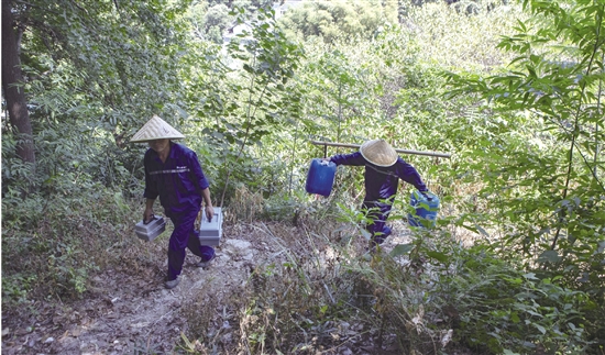 持续高温致使山区饮用水受到严峻考验。位于丰惠镇丰南村高山顶上的小南山农村供水站,承担着山区36户村民的供水任务,连日来,供水运维人员头顶烈日,开展水质检测,查看水源流量,维护净化设备,检查供水管道,用责任与坚守保障农村群众夏日用水无忧。图为供水运维人员正将净化水物资运送至高山供水站。 记者 朱胜钧 摄
