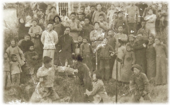 1937年9月,五夫“晨钟剧团”成立。图为剧团在百官街头演出《放下你的鞭子》剧照。
