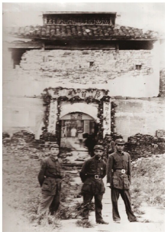 浙东游击纵队解放上虞,图为进入上虞县城丰惠城门情景。中为罗白桦,1945年8月任中共上虞县委书记。