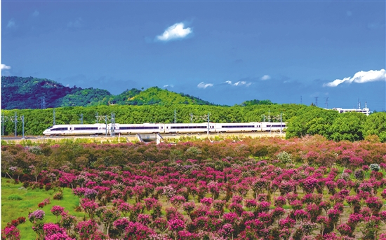 日前,高铁上虞南站旁的紫薇花进入盛花期,成片的紫红色花朵簇拥绽放,构成铁路沿线的一道生态风景线。图为9月18日,高铁穿行在紫薇花田边。