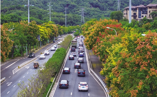 9月23日,晚高峰时段,车辆行驶在五彩缤纷的三环东路上。这几天的三环东路化身绚烂画廊,道路两侧栾树枝头迎来盛花期,金黄小花与绛红蒴果夹杂,在绿叶映衬下宛若天然油画。这份秋日限定美景,为忙碌的通勤时光注入温柔与惬意。