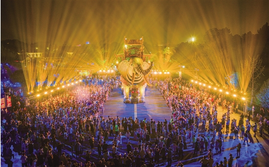 10月4日晚,中华孝德园吉象阁前灯火璀璨、人头攒动,机甲吉象“壮壮”成为夜游焦点,吸引大量游客驻足观赏。