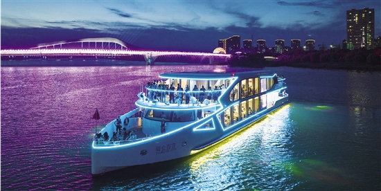 10月10日,夜幕降临,曹娥江上游船穿梭于两岸璀璨灯光中,舜江大桥、尚贤桥等地标建筑披上霓虹外衣,水幕投影与江风相映成趣。游客凭栏远眺,现代光影与传统江韵交织,沉浸式体验“一江两岸”城市新貌。自2024年曹娥江夜游项目首航以来,其已成为长三角热门夜游线路,累计接待游客超2万人次。