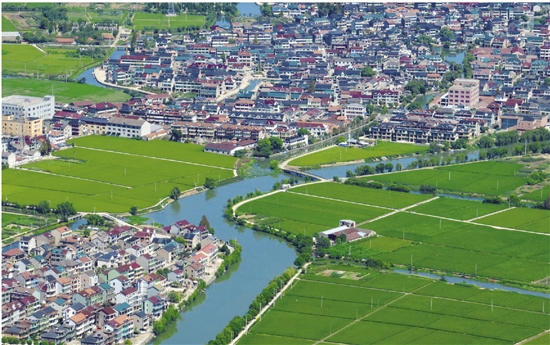 10月17日,虞北大地稻浪翻涌,田野、河道与村庄交相辉映,尽显和美图景。