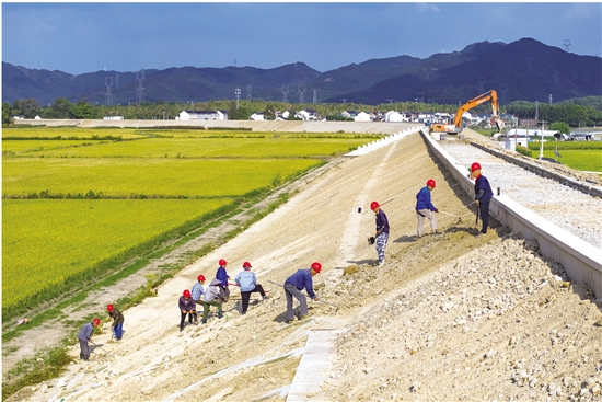 日前,曹娥江梁湖街道新花浦村段江堤上,工人正加紧开展提升加固作业。作为浙江省“千项万亿”重点项目,上虞区曹娥江中上游标准江堤提升加固一期工程建设稳步推进。