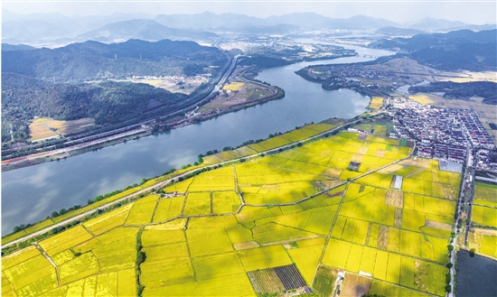 日前,曹娥江两岸上浦至章镇段一派丰收盛景。阳光下,晚稻铺满田野、一地金黄;高空俯瞰,金色田垄与蜿蜒江景相映成趣,共同勾勒出一幅壮阔秀美的田园图景。