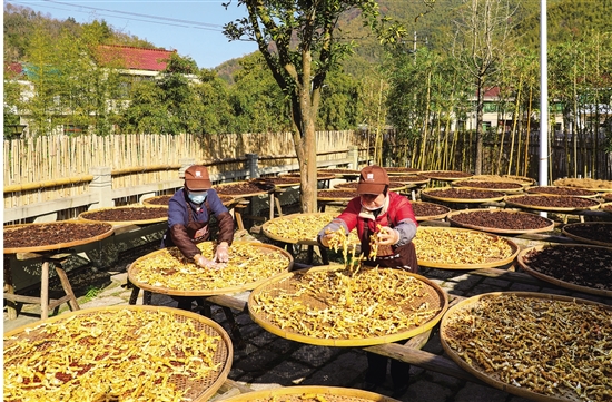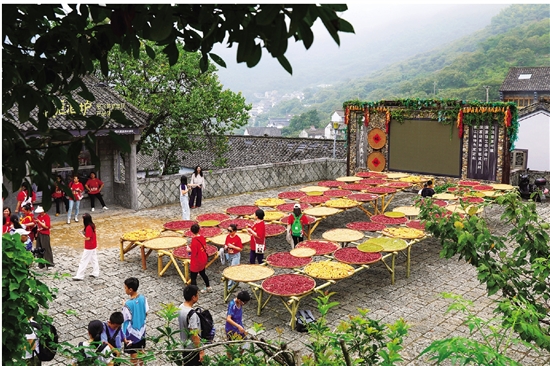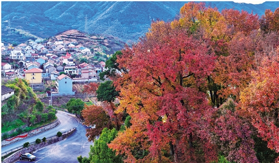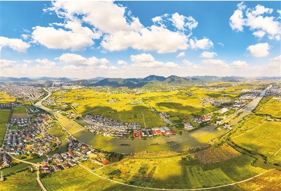 秋收的私语漫过阡陌。联合收割机在丰惠水网间划出金绸带,晒场竹匾叠成琥珀塔,玉米咧开嘴笑出阳光的褶皱。古村石阶上,孩童追逐着飘落的乌桕叶,惊醒了沉睡的晒秋图——竹匾里红辣椒是跳动的火焰,稻谷堆成的金山泛着温润的光。