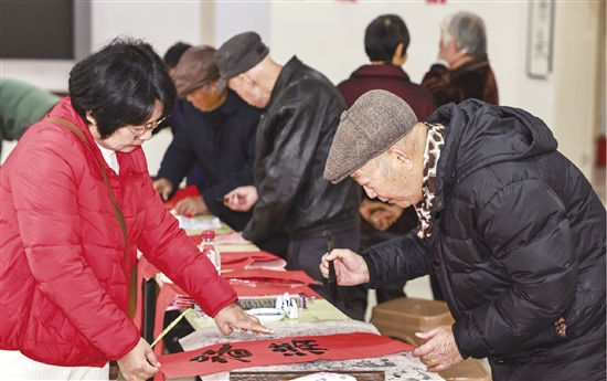 近日,兰亭书会在丰惠镇南门村文化礼堂开展迎春送春联活动。书法家们现场挥毫泼墨,书写春联与福字,将“平安如意”“福满人间”等美好祝愿融入笔端。活动持续数小时,累计赠送春联200余副,吸引村民争相领取,为寒冬增添浓浓年味。 记者 魏新宇 通讯员 葛晓霞 摄