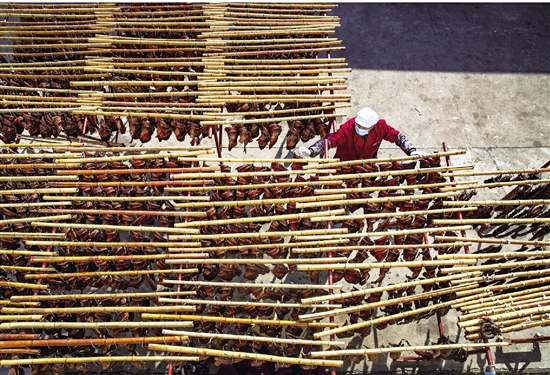 12月26日,东关街道担山村成英腌腊食品厂内,工人们分工协作,一边翻晒色泽油亮的酱鸭、鱼干,一边加紧包装腊肉、香肠,赶制订单。