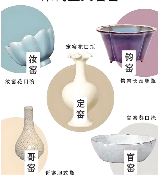 分北宋官窑和南宋官窑。北宋官窑在汴京(今河南开封),南宋官窑在浙江杭州。官窑以烧制青釉瓷器著称,胎骨颜色泛黑紫,有“紫口铁足”特征,釉层肥厚,常见天青、粉青等色泽,以釉色为主要装饰,少施纹饰。
