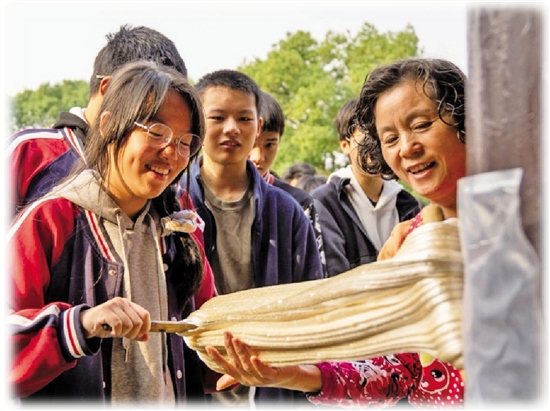 古镇街头,扯白糖、打糍粑的非遗摊位前围满了好奇的学生。“扯白糖是安昌的老手艺,要经过熬糖汁、酿糖浆、冷却定型等多道工序,少一步都不行!”操作扯白糖的阿婆一边演示,一边讲解技艺要领,学生们跃跃欲试,上手拉扯时才发现,看似简单的动作,实则考验着手臂力量与耐心。