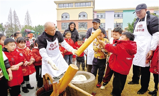 12月30日上午,丰惠镇中心幼儿园举办“庆元旦 迎新年”非遗文化进校园主题活动。活动特邀我区非遗传承人现场展示剪纸、麦编、搡年糕、棉花弹制等传统技艺,以沉浸式体验引导儿童近距离感受本土非遗魅力,助力传统文化薪火相传。