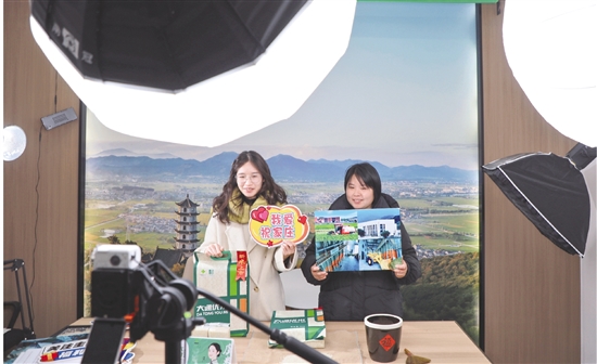 1月14日,在丰惠镇祝家庄村大通米业共富工坊,主播小罗手持一把颗粒饱满、色泽晶莹的大米,正热情地对着镜头向屏幕另一端的观众推介,短短几分钟,直播间互动不断,订单接连涌入。