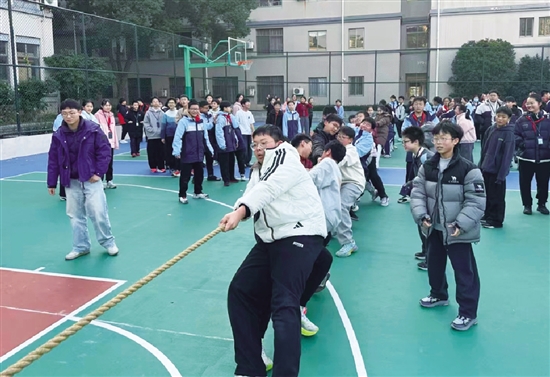 赛场上,各班队员们紧握绳索、全力以赴,场边啦啦队呐喊助威,“加油”声震天。