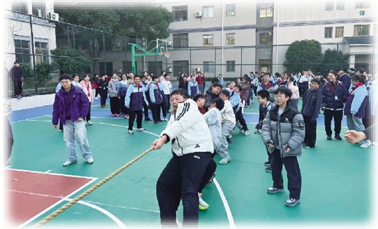 赛场上,各班队员们紧握绳索、全力以赴,场边啦啦队呐喊助威,“加油”声震天。