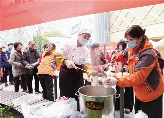 曹娥社区与暖心餐饮“虞家小鲜”携手开展送粥活动,厨师们精选食材熬制腊八粥,社区工作人员在小区门口有序分发。党员志愿者与工作人员还带着热粥走访慰问独居困难老人和新就业群体,与居民亲切交谈、送上祝福,不仅弘扬了尊老爱老的传统美德,更拉近了社区与居民的距离。