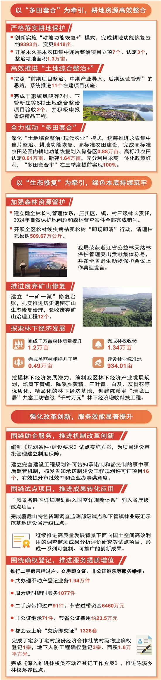 2025年,绍兴市自然资源和规划局上虞分局深入贯彻落实上级决策部署,聚焦保障、保护、服务三大主责主业,制定重点工作、项目计划、改革亮点、争先创优四张清单,迭代“1144”工作载体(10大计划盘子、10个争先创优项目、40项重点工作、40项改革创新特色亮点),以项目化、清单化、图册化、专班化推动目标任务高效落实,取得一系列丰硕成果,为全区经济社会高质量发展提供强有力的自然资源和规划保障。