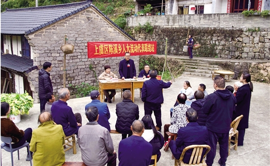 一条红色横幅下,两张旧木桌、几条板凳、几把椅子,拼成一个简易接待点,3名人大代表耐心听取群众意见……近日,陈溪乡创新推出“流动代表联络站”,每季度定期上山入村开展接待活动,受到群众好评。图为“流动代表联络站”走进夏家岙村。