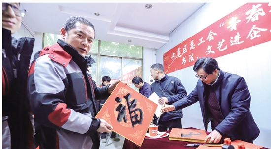 连日来,区总工会组织开展“青春建功·情暖职工”书法文艺进工会驿站、进企业惠职工活动,为一线职工、快递小哥、户外劳动者现场书写“福”字、春联,传递新春祝福、赞美劳动创造、送出工会“温暖”。