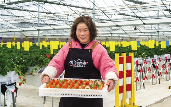 近日,谢塘镇东联村滚滚园家庭农场高架草莓喜获丰收。农场内,“香野”“粉玉”“越雪妃”等优质品种错落挂于高架之上,红润粉嫩、晶莹饱满,尽显诱人风姿。