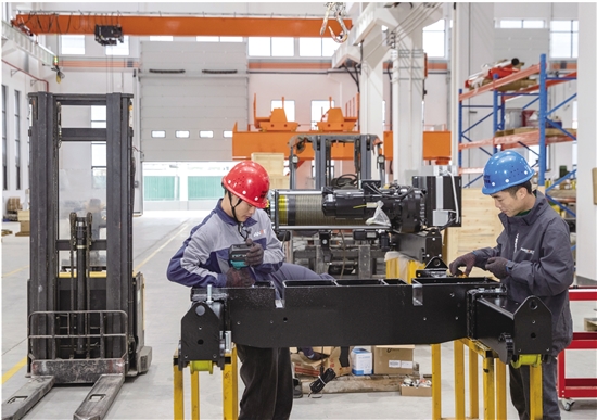近日,位于东关街道的绍兴南特起重设备有限公司新厂房内,精工、装配、电工等各条生产线有序运转,工人们正加紧赶制订单,一台台起重设备完成打包,即将发往海外市场。