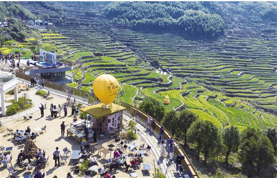 3月14、15日,正值周末,覆卮山景区迎来春日盛景。千年梯田上,油菜花海全面盛放,金黄一片,与“万年石浪”的沧桑、东澄古村的古朴相映成趣。绝美春色吸引力十足,两天内共吸引游客近5万人次前来踏青赏花,感受这独特的春日画卷。
