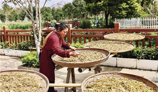 4月1日,丰惠镇西南门村,村民趁着晴好天气晾晒笋干菜。一排排竹匾里,金黄的笋片与干菜在阳光下散发出阵阵清香,成为春日乡村一道亮丽的风景。